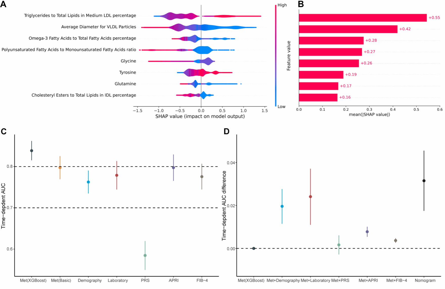 本研究以英国生物学银行中64005名未患有肝硬化并发症的社区人群作为研究对象,在训练队列中构建了基于梯度提升算法的代谢状态模型(图1),并与基因风险评分及传统临床评分等进行比较;同时整合代谢状态、人口统计学变量以及实验室检测变量,以构建易于解释的列线图模型,并基于双截断值法实现肝硬化并发症的人群风险分层。模型的预测能力于验证队列中进行独立评估。