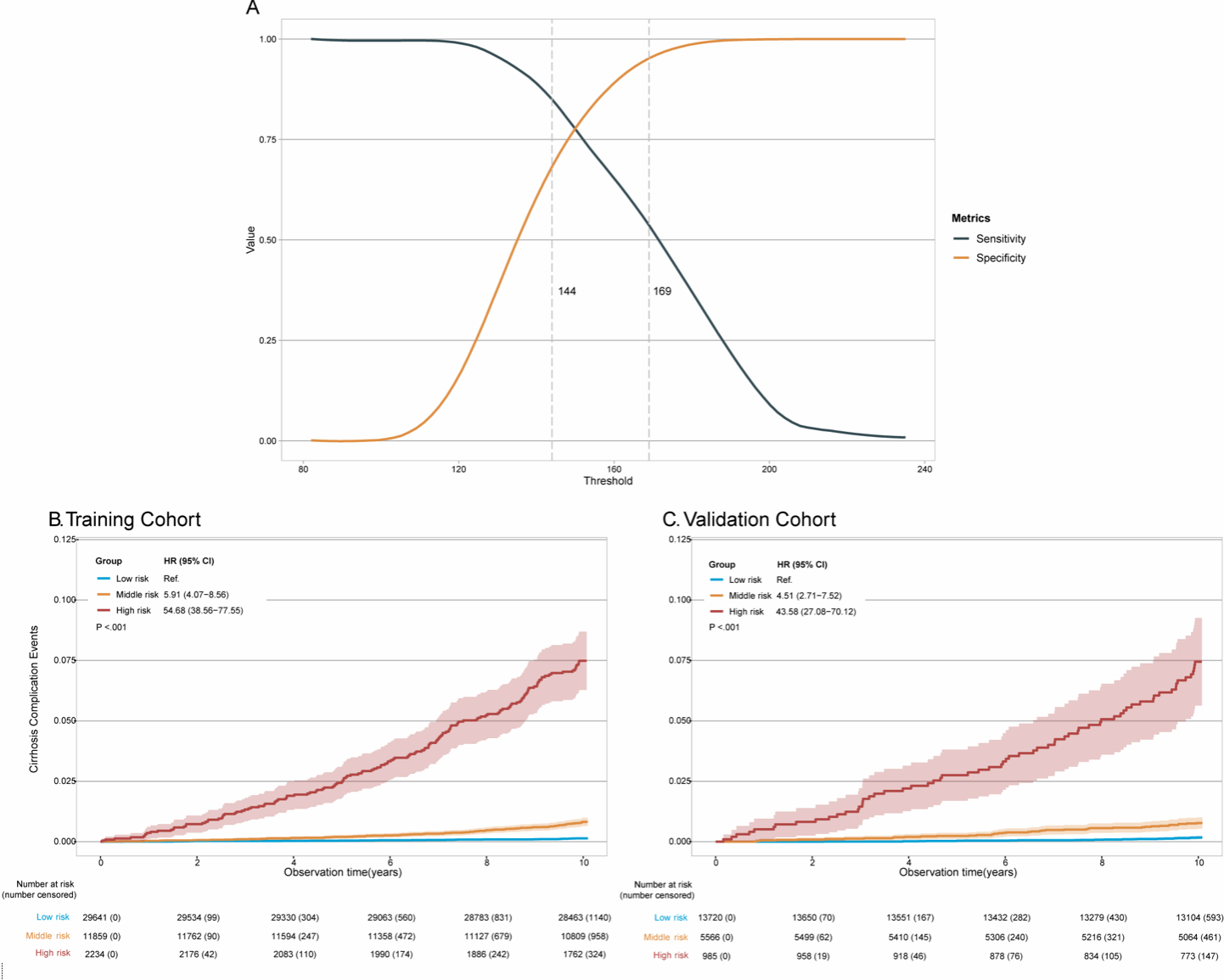 研究发现,脂质代谢物及铁死亡相关代谢物能够精准预测肝硬化并发症的发病风险。其中,代谢状态模型可以准确地预测10年肝硬化并发症的发生风险,模型的曲线下面积(AUC)为0.84,优于基因风险评分(AUC差值 0.25)与FIB-4评分(AUC差值0.06)。整合代谢状态的列线图模型在验证队列中的3年AUC为0.930,5年AUC为0.889,10年AUC为0.861。风险分层后高危组人群与低危组人群的风险比为43.58(95% CI 27.08-70.12)(图2)。