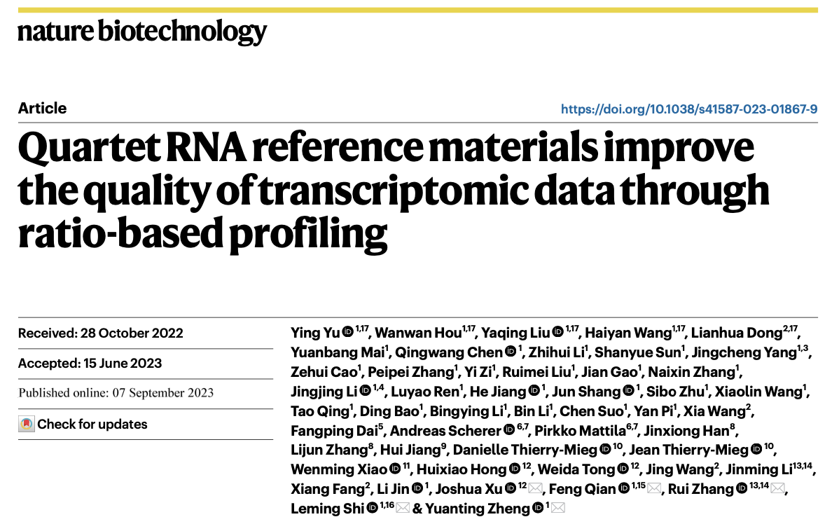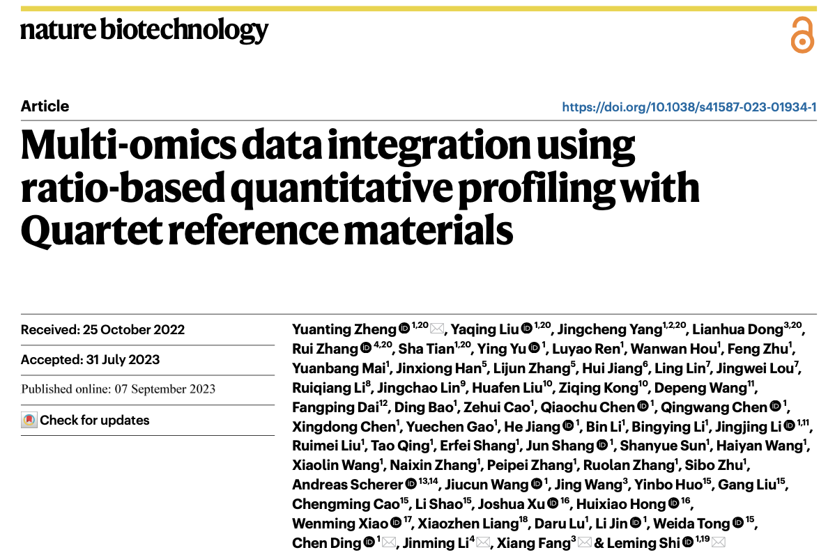 北京时间2023年9月7日晚,国际学术期刊《自然·生物技术》(Nature Biotechnology)在线发表了由复旦大学/上海国际人类表型组研究院石乐明、郑媛婷团队联合中国计量科学研究院方向、董莲华团队,国家卫健委临床检验中心李金明、张瑞团队共同研发的全球首套多组学标准物质“中华家系1号”的最新研究成果。同期刊发的2篇科研论文分别聚焦:“使用基于中华家系1号标准物质的相对定量进行多组学数据整合(Multi-omics data integration using ratio-based quantitative profiling with Quartet reference materials)”和“中华家系1号 RNA标准物质与基于比值的分析方法提高了转录组数据的质量(Quartet RNA reference materials and ratio-based profiling for assessing and improving the quality of transcriptomic data)”。这也标志着中国科学界自主研制、获批为“国家一级标准物质”的“中华家系1号(Quartet)”多组学标准物质的研发和效用得到了国际同行的认可,开创了生物医学“度量衡”新体系,将提升生命科学创新的源头质量,为全球推进人类表型组计划奠定坚实的标准基础。