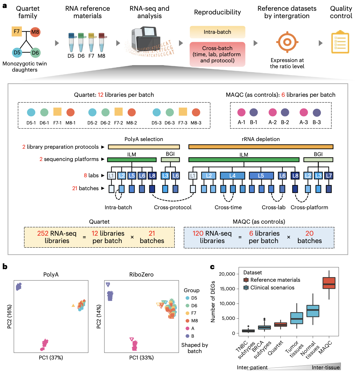 在本次发表的论文““中华家系1号”RNA标准物质与基于比值的分析方法提高了转录组数据的质量”中,研究团队指出,RNA标准物质是评估RNA-seq数据可靠性的宝贵工具,可在实验室批次内有效性和跨批次可重复性两方面对其可靠性进行客观评估。批次内有效性是在相同批次或实验室内的分析结果达到技术所能够达到的最佳水平,而跨批次可重复性是不同平台、实验室或批次间分析结果可重复,并且不受批次效应影响,跨批次数据整合后的结果与单批次结果可重复。“中华家系1号”RNA标准物质,具有微小的样本间差异、高度稳定性、长期可用性和易于生产性等特性,可用于临床应用场景下的能力测试和方法验证。