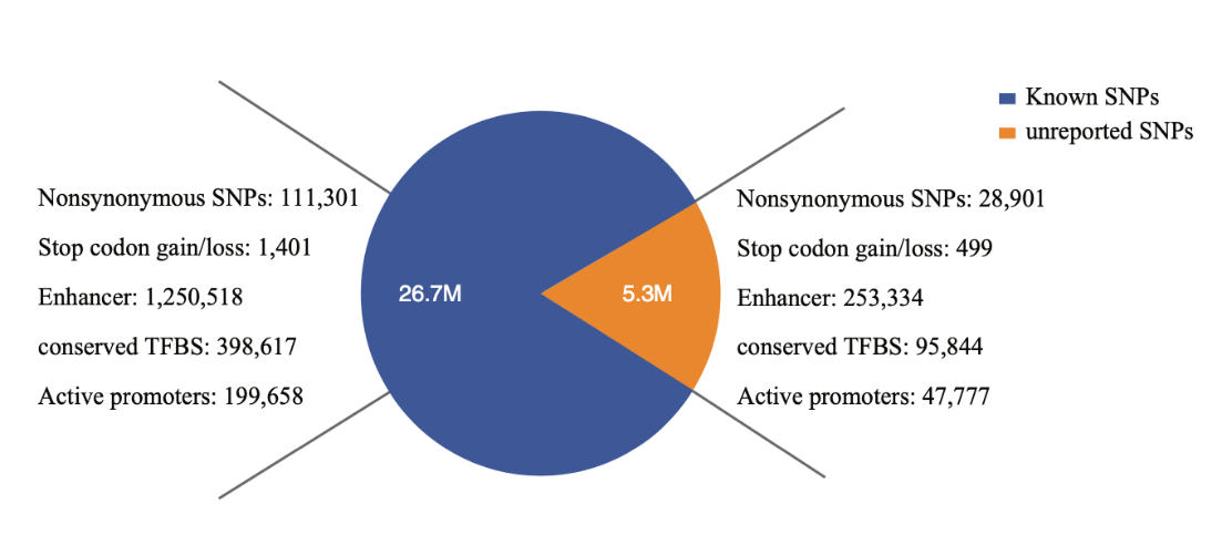 基于人类参考基因组,研究共发现3200万个单核苷酸多态性位点(single nucleotide polymorphism, SNP),其中大约530万个位点是在之前没有发现的。这些新发现的突变广泛的存在于增强子、启动子以及转录因子结合位点等基因组功能区域。