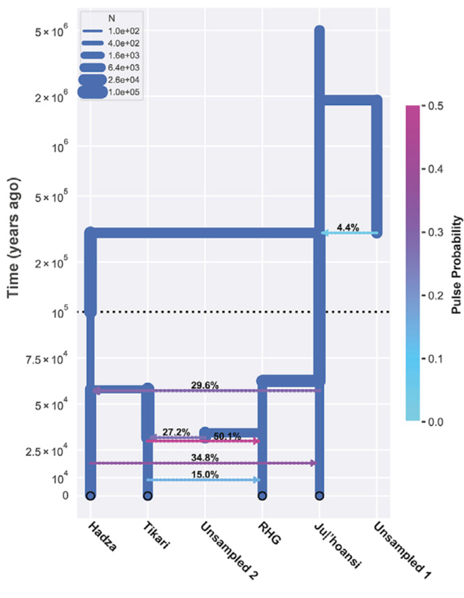 当然,由于存在基因交流和遗传重组等因素的影响,上述邻近距离法、主成分分析和ADMIXTURE无法用来构建现代人类早期遗传结构。而当科学家将这些因素全部纳入到复杂模型中进行计算分析时却进一步发现:现代桑人和小矮人的共同祖先,而不是现代桑人的祖先,是现代人类最早分歧的一支。并且研究推断现代人类的分歧发生在28万年前,这与之前的考古和基于古DNA检测推断的时间一致。