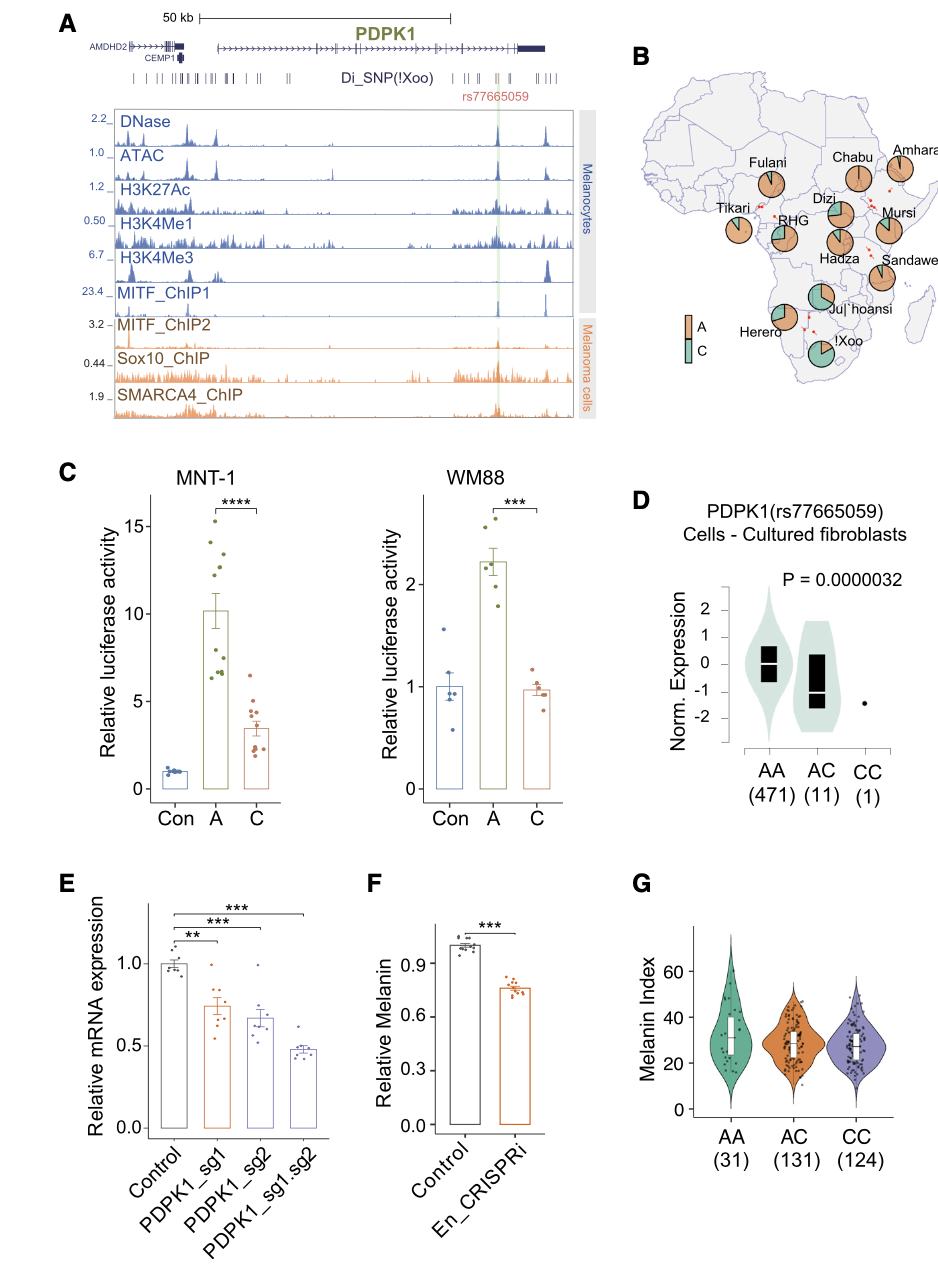 利用功能基因组学等方法,本研究发现一个位于PDPK1基因内部增强子的突变rs77665059-C,是影响桑人浅肤色的一个决定性的因素。该增强子仅在黑色素细胞中特异活跃,使用Crispri沉默该增强子会降低PDPK1基因的表达量和黑色素和合成。研究进一步发现rs77665059-C在桑人部分人群中频率超过了80%;但是在其它非洲(平均频率14%)和非洲外民族中(平均频率3%)频率却非常低。研究发现rs77665059-C突变会导致PDPK1基因增强子在黑色素瘤细胞系中活性降低,降低PDPK1基因的表达,并且与桑人中的浅肤色表型显著相关,这为桑人浅肤色进化的研究提出了新的遗传学解释。