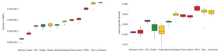 研究发现12个非洲民族的平均SNP个数和遗传多态性均具有显著的差异。以打猎和收集为生的桑人(Ju|’hoansi和!Xoo)和热带雨林小矮人(rainforest hunter-gatherther, RHG)的SNP数量和遗传多态性最高,而Amhara,Fulani,Chabu以及Hadza等民族的遗传多态性则最低。而大量非洲外人群的基因渗入(在Amhara和Fulani人群中)以及严重的群体瓶颈(在Hadza和Chabu人群中)是造成部分非洲人群体遗传多态性低的主要原因。例如,生活在坦桑尼亚的Hadza和埃塞俄比亚的Chabu群体的人口数量已经少于1000人。