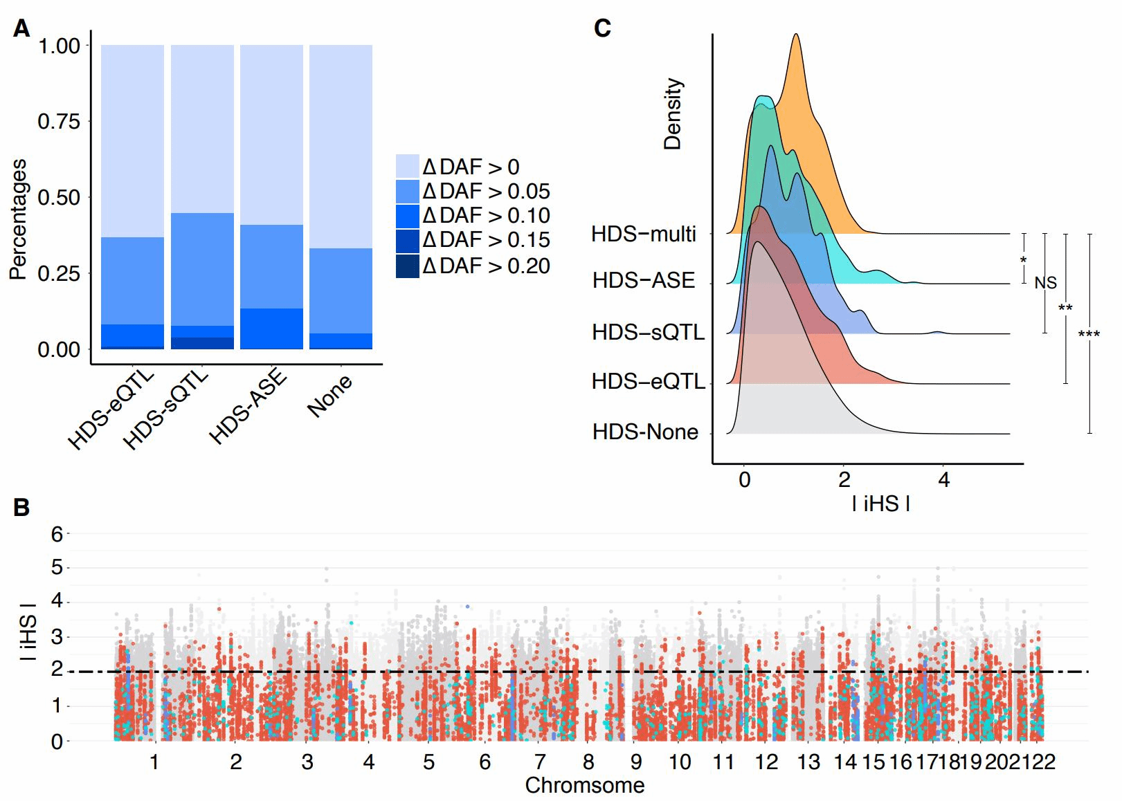 该研究针对在东西方人群中高度分化的基因,基于全基因组及全转录组数据分析,构建了东西方显著差异基因在维吾尔族外周血表达图谱;鉴定了全基因组范围的表达数量性状位点(eQTL)、可变剪接数量性状位点(sQTL)、等位基因特异性表达位点(ASE)等影响基因表达的关键遗传变异;揭示了这些关键变异涉及的基因中留下的适应性进化印迹,这些非中性演化的迹象在代谢、免疫等疾病易感基因中体现尤为突出;有可能与新疆维吾尔族代谢及免疫相关流行性疾病中有密切的关系,包括II型糖尿病、乳糖不耐受、I 型糖尿病、非酒精性脂肪性肝病、肺结核、炎症性肠病、哮喘、自身免疫性甲状腺疾病、利什曼病等。研究团队推测这些多样性的形成很可能在东西方人群融合过程由于环境变迁和生活方式转变而导致。