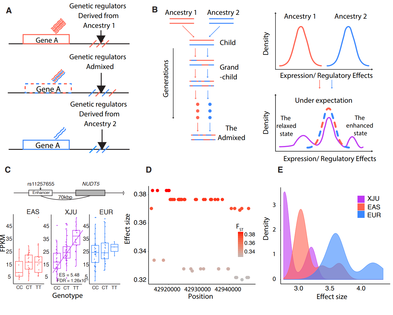 为了探究遗传混合对表达调控的作用机制,研究团队对维吾尔族基因表达调控的遗传变异进行了祖源解析,进一步构建了遗传调控模型,探讨了人群遗传交融在包括基因表达在内的表型多样性产生和演化中的影响和驱动机制;为深入理解东西方人群表型分化的遗传基础、以及遗传混合对表型多样性的影响机制提供了新的视角和见解。