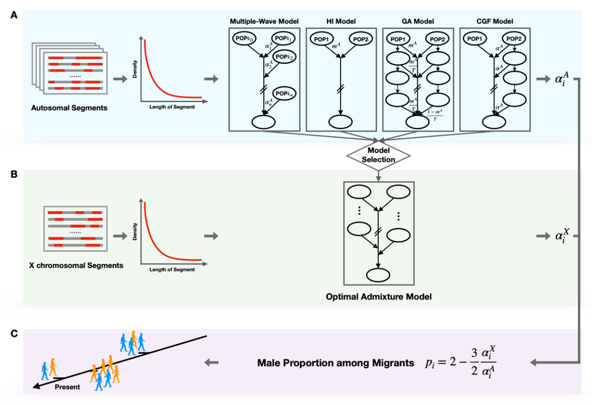 性别偏向性实际上广泛存在于人群基因交流过程中,即特定祖源的男女遗传贡献存在差异。非裔美国人(African Americans)和拉丁裔美洲人(Hispanic Americans or Latino American)为学界熟知的存在性别偏向性混合的人群。性别偏向性混合的研究对了解人群形成和演化历程、理解现代人类遗传差异、以及指导医学研究都有重要的理论意义和应用价值。然而,受限于分析方法,人群演化历史上错综复杂的基因交流中存在的性别偏向性长期以来未得到充分研究,特别是一些经历过多次而复杂基因交流历史的人群,曾经发生的不同方向的性别偏向混合往往被忽视。MultiWaverX的提出在很大程度上为这些问题的解决提供了新方法和新思路。
