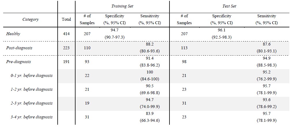 开展研究的过程中,校企科研团队融合生命科学和大数据科学多学科手段,基于ctDNA甲基化特质设计了一套机器学习方法。为严格控制大数据分析中常见的过拟合隐患,采用计算样本中每个靶基因组区域的平均甲基化水平和集合logistic回归(LR)分类器的组合,并充分考虑大量的干扰因素,以完成区分健康患者与癌症患者的分类模型搭建。该分类器在训练集中的特异性为94.7%,对确诊后采集的病人样本以及未确诊之前采集的样本分别达到88% 和91% 的敏感性。在一个独立的测试样本集中,该研究团队在207个健康对照样本重现96%的特异性的前提下,在113个确诊后采集的病人样本上达到了88%的敏感性(表1,图1B-D)。接下来,在98名未确诊之前1-4年采集的样本中PanSeer技术达到了95%的检测敏感性(表1,图2B)。