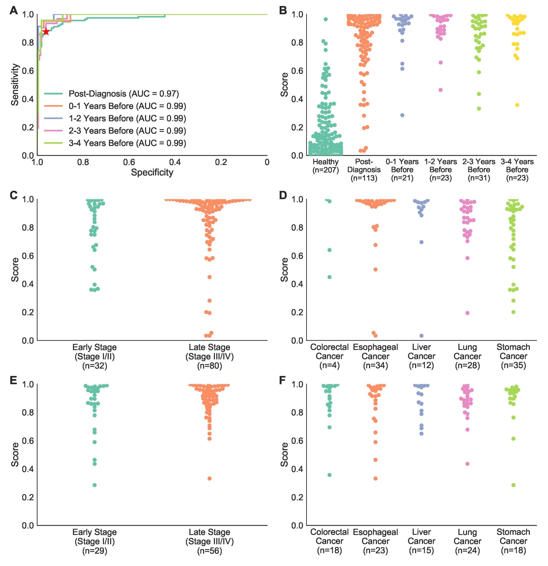 A、PanSeer®分析中接收算子特征曲线(ROC)和曲线下面积(AUC)值。红星表示从训练集导出的截止值。