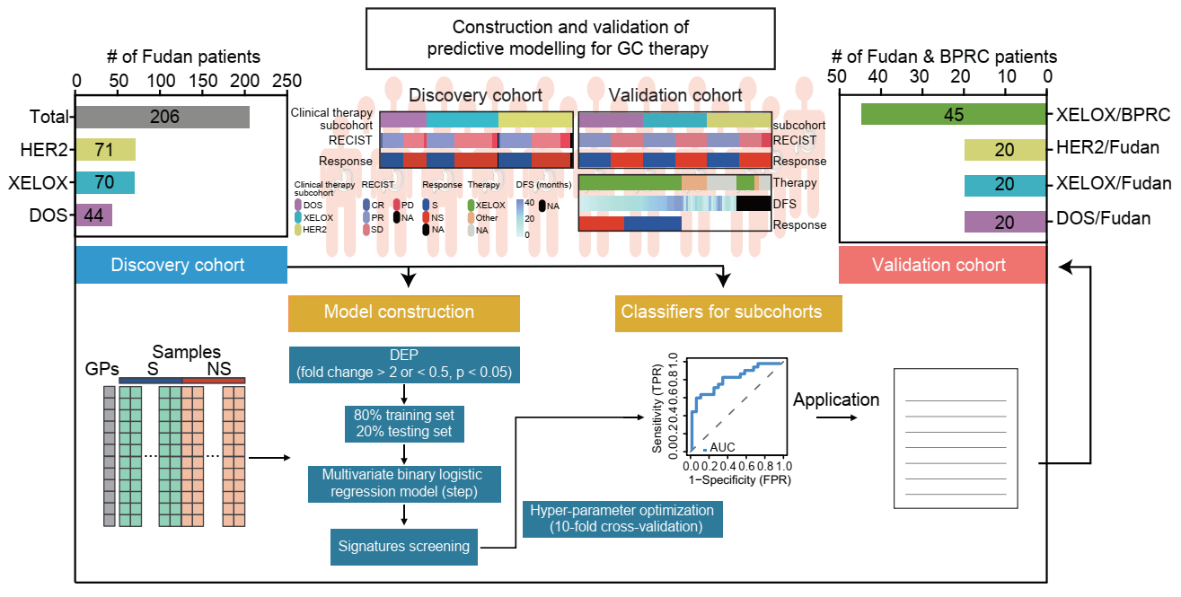 基于此,复旦大学人类表型组研究院/生命科学学院丁琛教授团队、复旦大学附属中山医院侯英勇教授团队和上海交通大学医学院附属新华医院赵健元教授团队联合对接受一线治疗 (包括DOS治疗,XELOX治疗及抗HER2靶向联合治疗) 的206例中国胃癌患者的治疗前样本进行了蛋白质组学定量分析 (图1)。相关研究成果以“蛋白质组学特征揭示了胃癌对化疗和靶向治疗反应的治疗新策略(Proteomic Characterization of Gastric Cancer Response to Chemo and Targeted therapies Reveals New Therapeutic Strategies)”为题,于北京时间2022年9月29日在线发表于最新一期《自然·通讯》(Nature Communications)杂志上。