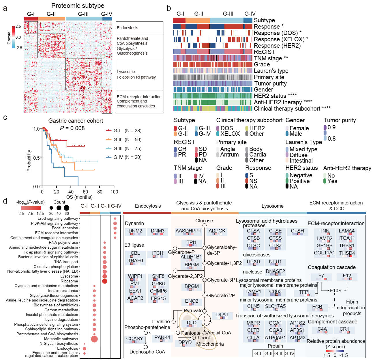本研究绘制了胃癌不同治疗反应相关的全面蛋白质表达图谱,确定了与治疗反应及预后显著相关的分子分型(G-I-G-IV)。G-I亚型以内吞为主要特征,G-II亚型以糖酵解、泛酸盐和辅酶A生物合成为主要特征,G-III亚型以溶酶体为主要特征,G-IV亚型以细胞外基质受体相互作用和凝血补体级联反应为主要特征。结合治疗反应,从G-I亚型到G-IV亚型,化疗和靶向治疗反应呈现出逐渐的耐药现象: 敏感患者比例从60%急剧下降到20%;相反,非敏感患者的比例从40%增加到80%。其中,G-IV亚型预后最差(图2 a-d)。此外,在其他独立胃癌队列中验证了该分子分型。本研究发现微卫星不稳定的胃癌患者对DOS治疗反应敏感,但对XELOX治疗反应不敏感。生物信息学分析显示,与非敏感组相比,DOS敏感组的T细胞受体信号转导活跃,CD8+T中央记忆细胞积聚,而XELOX治疗则相反。进一步比较分析显示,TCR信号转导水平高的胃癌患者不太可能从XELOX治疗中获益,而可以从联合抗HER2靶向治疗中获益;而ECM及其下游PI3K-AKT通路的激活会削弱HRE2治疗的抗肿瘤作用。接下来,本研究进行了进一步的体外验证实验, 证实了抗HER2靶向治疗与XELOX或PI3K-AKT抑制剂联合的协同效应。