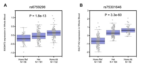 图2:B3GNT2和SULT1A2基因表达水平与基因型密切相关