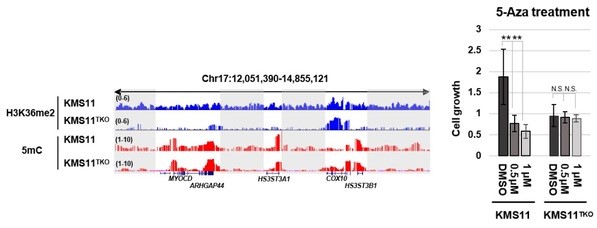 研究人员进一步寻找此类调控的生理和病理意义。NSD(nuclear receptor binding SET domain cotaining,又名MMSET和WHSC1)家族甲基转移酶是H3K36me2主要的催化酶,它们常常在多类疾病中存在变异。例如,NSD2染色质易位过表达而引发的H3K36me2 水平升高是t(4;14)多发性骨髓瘤(multiple myeloma, MM)的主要致病原因。为了进一步研究H3K36me2对于5mC的可能调控机制及潜在生物意义,研究人员选取常用的KMS11(含NSD2易位,H3K36me2异常高)和KMS11TKO(NSD2易位KO,仅有一个NSD2正常表达的拷贝,H3K36me2回复接近正常)细胞模型进行研究。研究发现,KMS11中NSD2的过表达和高水平的H3K36me2导致了全基因组5mC水平的显著升高, 进一步通过ChIP-seq和MeDIP-seq分析对比KMS11和KMS11TKO的表观谱,发现这些异常的DNA高甲基化主要分布在基因间区。最后,研究人员发现,DNA甲基化抑制剂5-aza 处理可以特异性抑制KMS11细胞增殖而对KMS11TKO细胞影响较小,提示异常DNA甲基化抑制剂在t(4;14)多发性骨髓瘤治疗中的潜在价值。