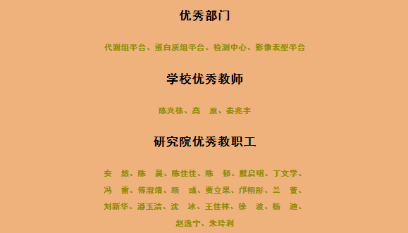 会上,执行院长田梅宣读了《关于表彰2021年度优秀部门、个人决定》名单。经过严格评定,2021年,代谢组平台、蛋白质组平台、检测中心、影像表型平台分别获优秀部门荣誉称号、陈兴栋、高 原、秦兆宇分别获学校优秀教师荣誉称号、安 然、陈 晨、陈佳佳、陈 郁、戴启明、丁文学等20位老师获研究院优秀教职工荣誉称号。