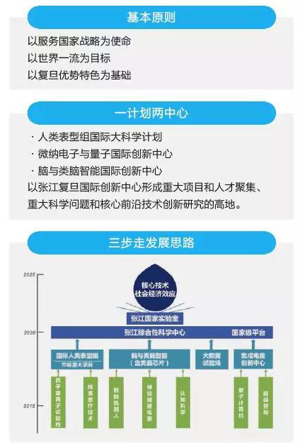 2020年前,培植、孵化、壮大信息技术与生命和健康,及其交叉领域(脑与类脑智能),为张江综合性国家科学中心提供高水平内涵,为张江实验室输送脑与类脑智能等主力板块,促成第一期建设启动,建设一批新型科技机构;基本完成张江复旦国际创新中心基本建设和基础架构;实现离子重离子试验线等第二批复旦项目成为上海和国家级重大项目。