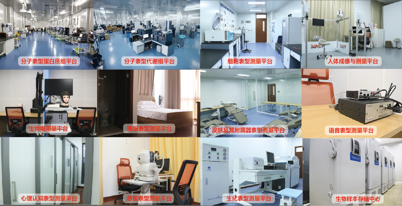 表型院已初步建成世界首个跨尺度、多维度的人类表型组精密测量平台:国际领先的分子表型蛋白质组平台(拥有全球领先的8套超高分辨蛋白质组质谱分析系统,其中2套Orbitrap Fusion Lumos,5套Q Exactive HF-X,1套timsTOF PRO),国际一流的分子表型代谢组平台(拥有全球领先的27套代谢组核磁共振和质谱分析系统,其中14套UHPLC-QQQ/OTRAPMS,9套UHPLC-QTOFMS,2套GC-FID/MS,1套UHPLC-ICPMS,1套600MHz NMR(IVDr)),国际一流的功能表型测量平台(睡眠与生物电,人体成像与测量等),国内领先的组学质量控制参比实验室,可以为人类表型组学研究提供强有力的平台支撑。同时,表型院已开展多项大型人群队列研究(自然人群,心梗、癫痫、衰老等特定人群),细致描绘代表人群的全表型谱,系统解析表型组与基因组的关联,发现人类健康和疾病等表型特征形成的内在规律和生物标志物。