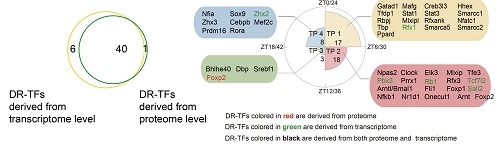 然而长期以来,由于技术的局限性,尤其在蛋白水平上对于低丰度转录因子鉴定及DNA结合活性定量上存在困难,对于昼夜节律中节律性转录因子的研究多集中在基因组和转录组水平上。但由于转录后调控、翻译后修饰等复杂过程的存在,基因转录水平与最终蛋白表达水平有一定差异,仅从基因组水平和转录水平无法直接地、全面揭示转录因子节律性。不仅如此,鉴于昼夜节律是一个多维度的调控网络,如何能全方位、多维度的揭示昼夜节律对组织器官生理功能的调控,也是阻碍昼夜节律研究的瓶颈之一。