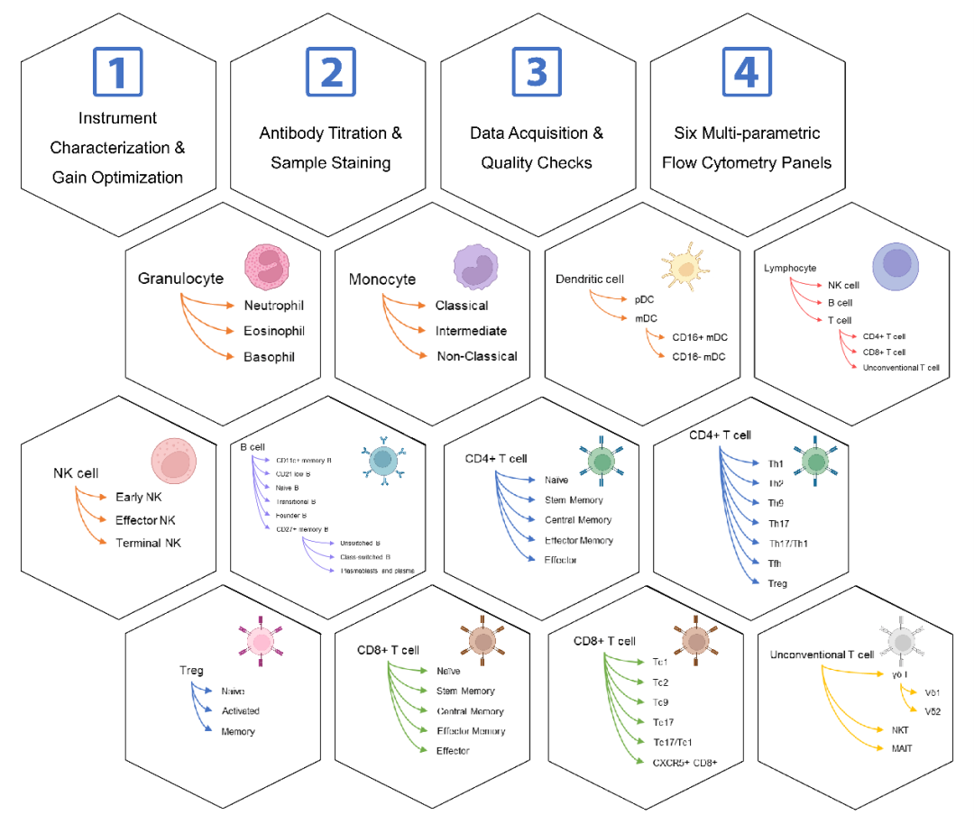 为了确保数据的可靠性,平台还构建了一整套详细的标准操作程序,包括 1)流式细胞仪参数优化,2)抗体滴定和样品染色,3)数据采集和质量检查。该套标准化操作体系具有良好的实用性,已被应用于多个队列研究中。该方案中的流式多色 Panel在探索性研究中也可自由组合及拓展,有助于更好地研究人类免疫系统的复杂性。