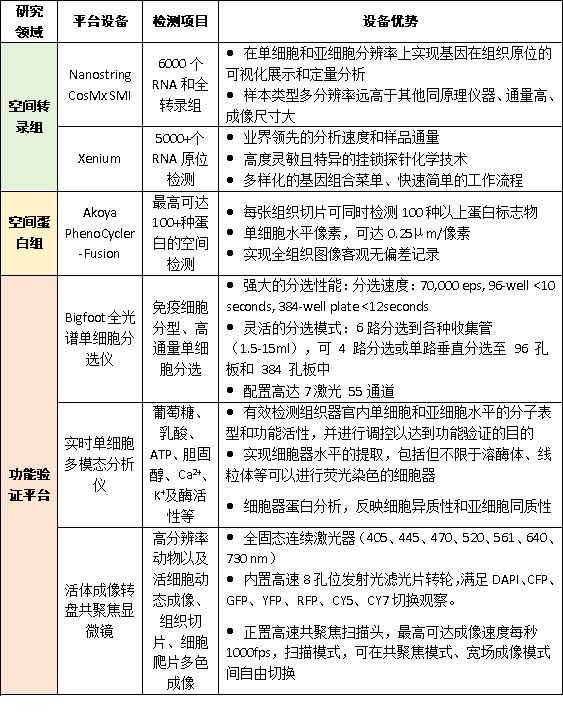 目前本平台可全面支持校内外科研团队在空间组学、基因分子表型分析、免疫表型鉴定、功能验证等领域的创新研究需求。平台配备包括空间转录组Bruker CosMx SMI、10x Genomics Xenium,空间蛋白组Akoya PhenoCycler-Fusion,功能验证平台Bigfoot全光谱超速单细胞分选仪、实时单细胞多模态分析仪、活体成像转盘共聚焦显微镜等在内的先进设备,并由经验丰富的专业技术团队负责设备运维、方法开发及实验操作,确保数据质量与实验效率。我们诚挚欢迎各科研单位前来洽谈合作,共同推进生命科学前沿研究。