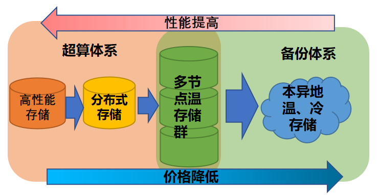 大数据平台建设有包括热-温-冷三级的数据存储系统,热存储系统为分布式高速混闪存储集群,配备高速RDMA网络,热存储系统总容量超过10PB;温存储系统为中速NAS存储;并配有存储磁带库进行冷存储。同时,平台与复旦大学校级平台CFFF实现了异地高速备份。