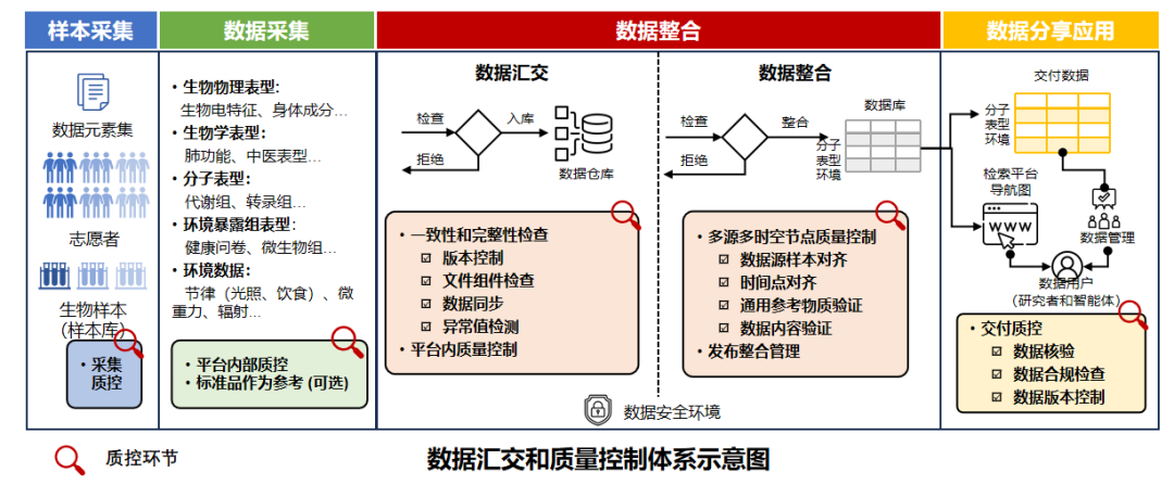大数据平台建设有支持多组学、跨平台负责科研项目研究的数据汇交与数据质控联合治理体系。该体系覆盖从样本采集、数据采集、数据汇交、数据整合直至数据共享应用的全流程、多组学、跨平台的数据联合治理体系,实现跨阶段的数据一致性与跨模态的数据可靠性保障。在样本采集与数据生成阶段,该体系以统一的数据要素(CDE)和公共数据模型(CDM)为架构基础,并在实验环节引入标准化质控样本与通用参考物质,以实现平台内部的一致性保证与批次监测;在数据汇交与整合阶段,设置内容对齐检查、版本控制、异常值检测、多元多时空节点质量控制等多重指控环节,确保数据在不同来源、不同时间与不同技术路线下仍保持结构可比与生物学一致性。这种多层级、可追踪、可干预的联合治理体系,有效解决了传统多组学数据治理中数据一致性和可靠性的问题,为大规模、长周期、跨平台的队列研究提供了可复制、可推广的治理范式。