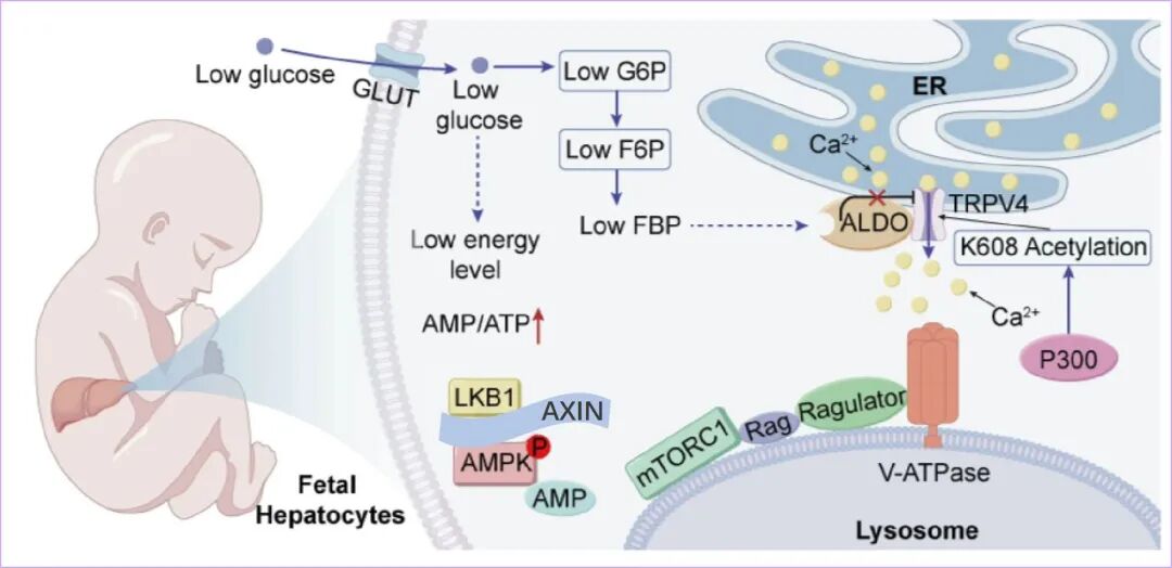 在成年细胞中,低糖会通过一系列信号(例如此时醛缩酶无法与足够多的果糖-1,6-二磷酸(FBP)结合)最终导致TRPV4关闭,进而抑制mTORC1。在胎儿肝脏中,研究团队基于质谱初步锁定多个潜在的修饰位点,随后通过构建位点特异性突变体并结合功能学实验逐一验证,最终确定,TRPV4蛋白的第608位赖氨酸(K608)发生了独特的“乙酰化”修饰。这种翻译后修饰如同一个化学标签,直接阻断了低糖信号对TRPV4的通道抑制作用,使得mTORC1活性得以维持。